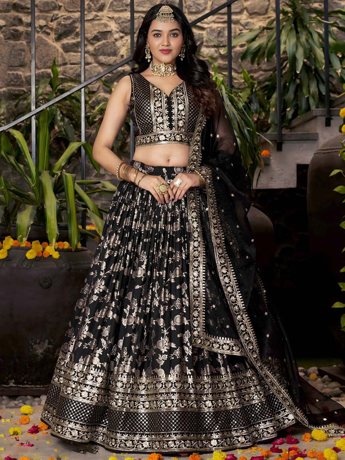 The dress in the picture is a traditional lehenga ensemble in a sophisticated black color. It features: - Choli (Blouse): Made from dola silk jacquard, adorned with intricate and elegant work. The blouse has a sleeveless design and a structured fit with a deep neckline. - Lehenga (Skirt): Also crafted from premium dola silk jacquard, this skirt features exquisite detailing throughout, with a rich and elaborate border. - Dupatta (Scarf): Made from dola silk jacquard, it complements the lehenga and choli with matching elegant work and detailing. - Size Details: The size is XS (AU 6), with a bust measurement of 34 inches. It comes with an extra margin, a stitch line, and a side or back zip for fitting adjustments.