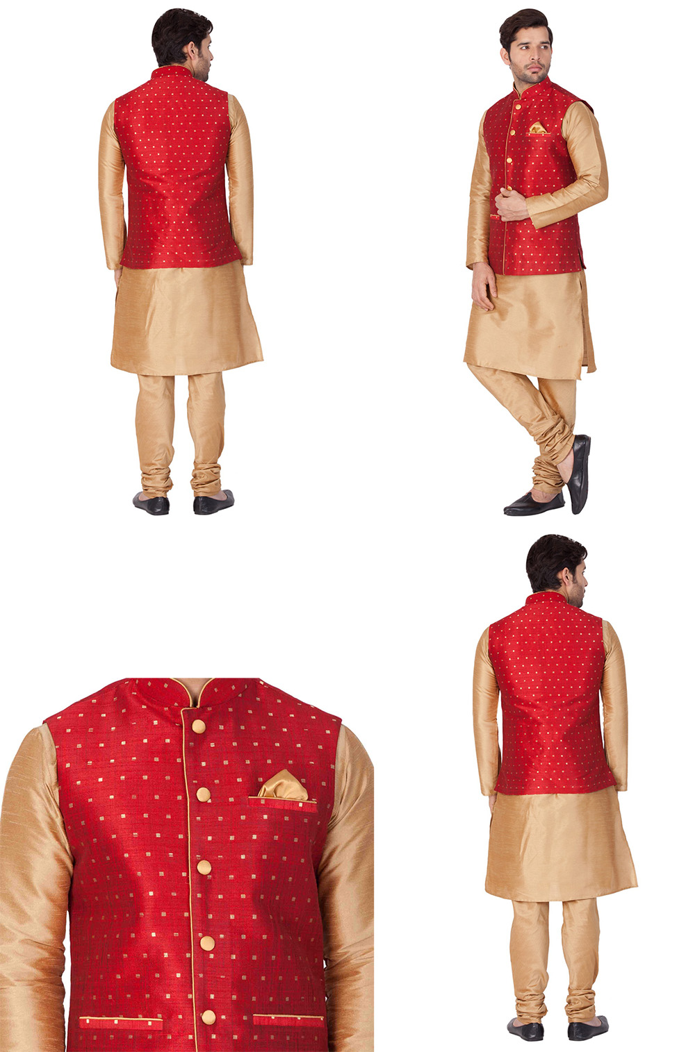 This ready to wear stylish kurta pajama jacket comes in a premium cotton-silk blend. Kurta and pajama come in a premium cotton-silk blend. Nehru jacket comes in a premium cotton-silk blend.