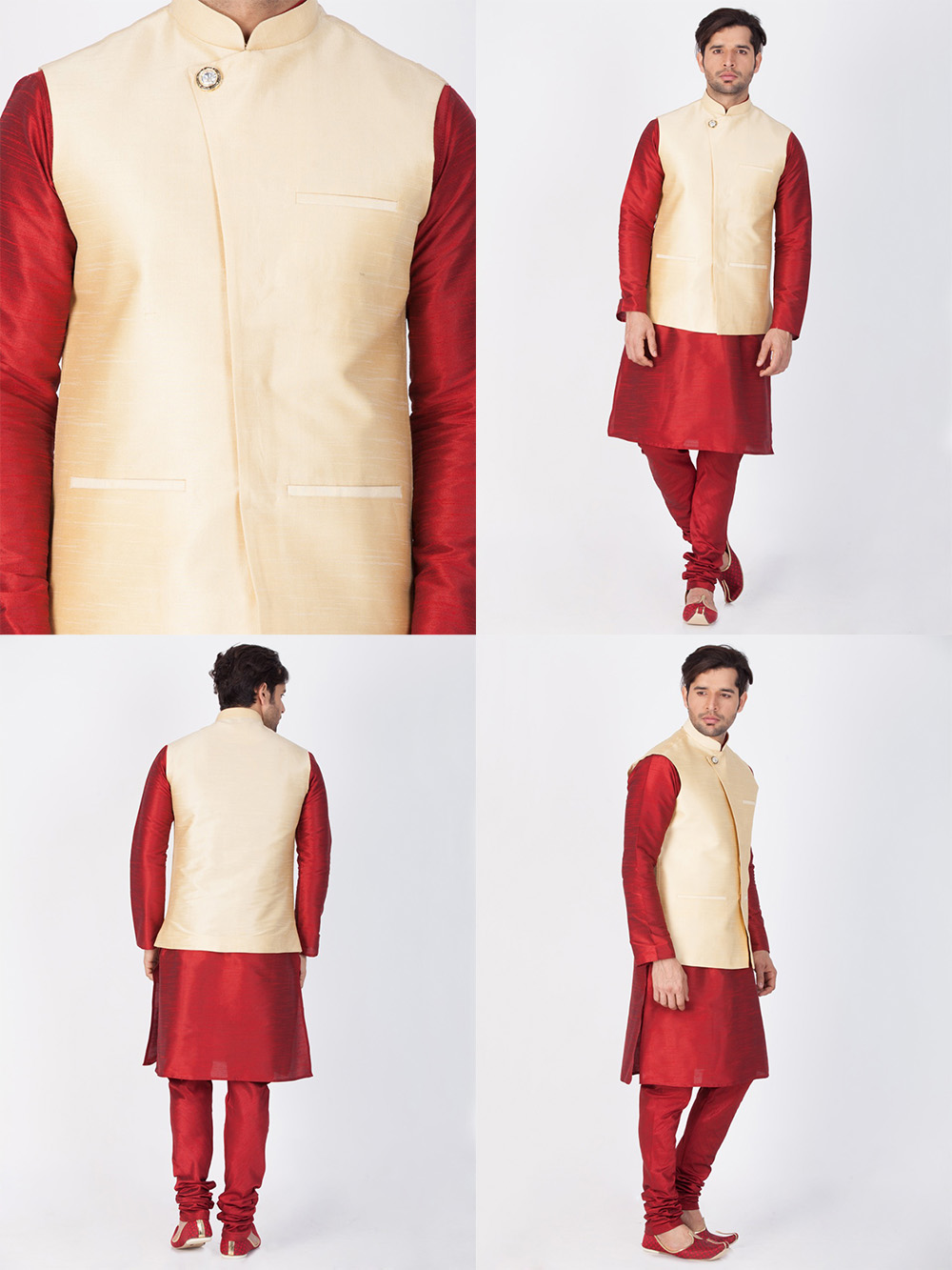 This ready to wear stylish kurta pajama jacket comes in a premium cotton-silk blend. Kurta and pajama come in a premium cotton-silk blend. Nehru jacket comes in a premium cotton-silk blend.