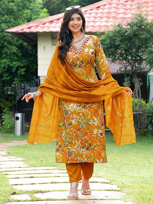 This beautiful pant suit top comes in rayon and is enhanced with elegant work. The designer pant bottom comes in premium rayon. Dupatta comes in jacquard.