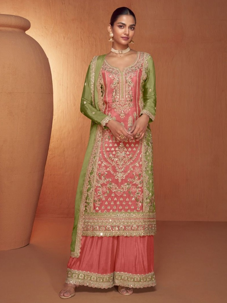 This beautiful salwar kameez sharara suit top comes in chinon and is enhanced with elegant work. The designer sharara bottom (salwar) comes in premium chinon. Dupatta comes in chinon.
