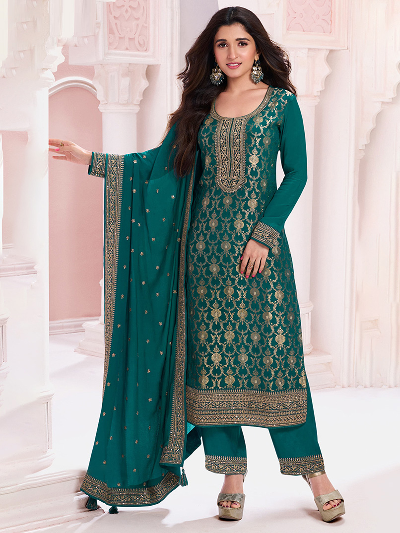 This beautiful salwar kameez pant suit top comes in chinon jacquard and is enhanced with elegant work. The designer pant bottom (salwar) comes in premium santoon. Dupatta comes in chinon jacquard.