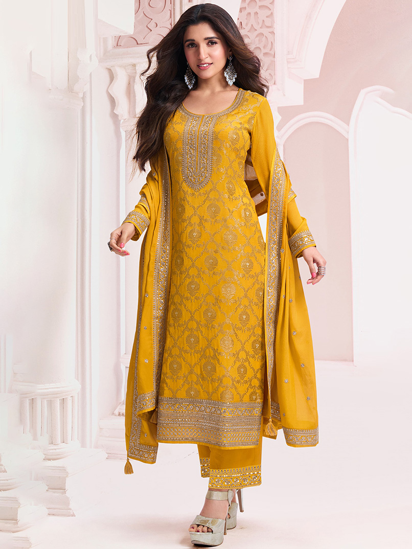 This beautiful salwar kameez pant suit top comes in chinon jacquard and is enhanced with elegant work. The designer pant bottom (salwar) comes in premium santoon. Dupatta comes in chinon jacquard.