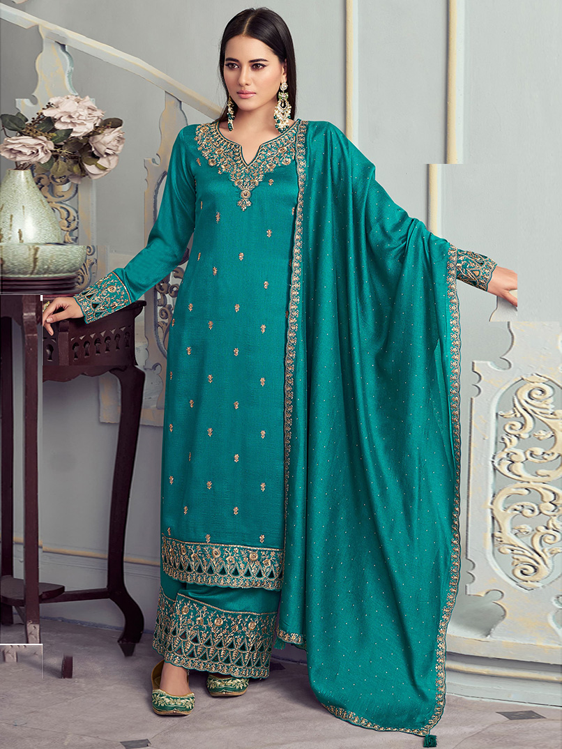 This beautiful salwar kameez palazzo suit top comes in silk georgette and is enhanced with elegant work. The designer palazzo bottom (salwar) comes in premium silk georgette. Dupatta comes in silk georgette.