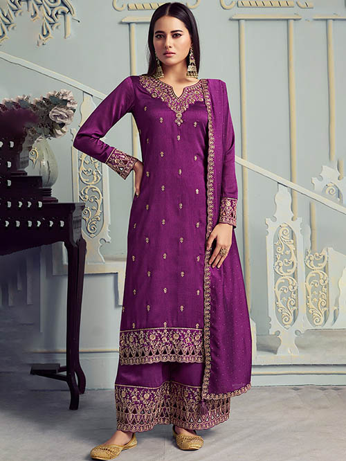 This beautiful salwar kameez palazzo suit top comes in silk georgette and is enhanced with elegant work. The designer palazzo bottom (salwar) comes in premium silk georgette. Dupatta comes in silk georgette.