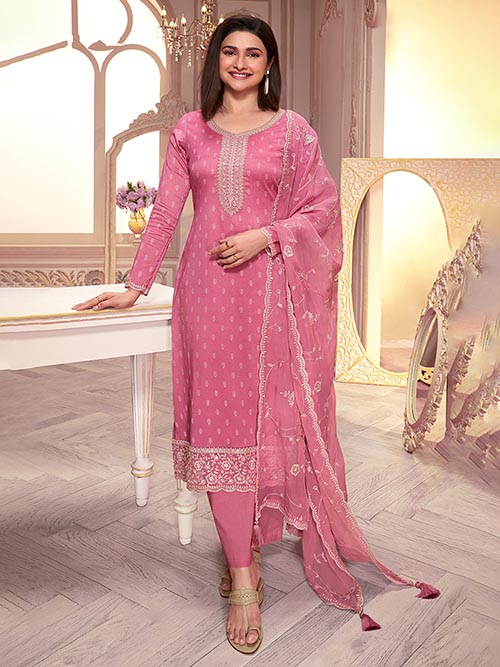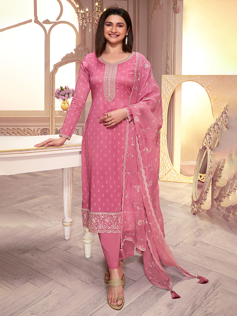 This beautiful salwar kameez pant suit top comes in georgette and is enhanced with elegant work. The designer pant bottom (salwar) comes in premium santoon. Dupatta comes in viscose chinon.