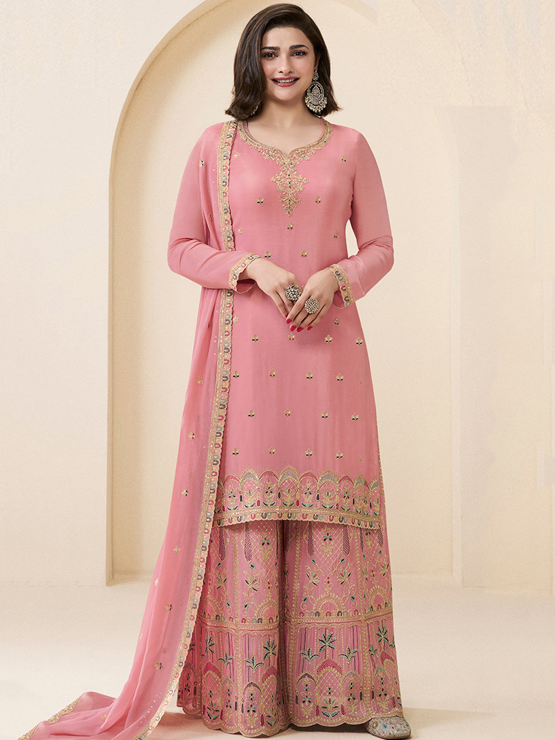 This beautiful salwar kameez sharara suit top comes in chinon and is enhanced with elegant work. The designer sharara bottom (salwar) comes in premium chinon. Dupatta comes in chinon.