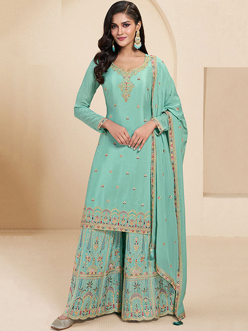 This beautiful salwar kameez sharara suit top comes in chinon and is enhanced with elegant work. The designer sharara bottom (salwar) comes in premium chinon. Dupatta comes in chinon.