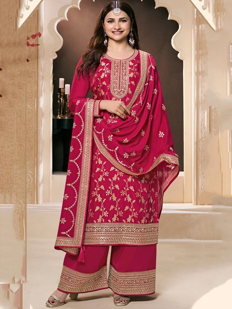 This beautiful salwar kameez palazzo suit top comes in silk and is enhanced with elegant work. The designer palazzo bottom (salwar) comes in premium santoon. Dupatta comes in chinon.