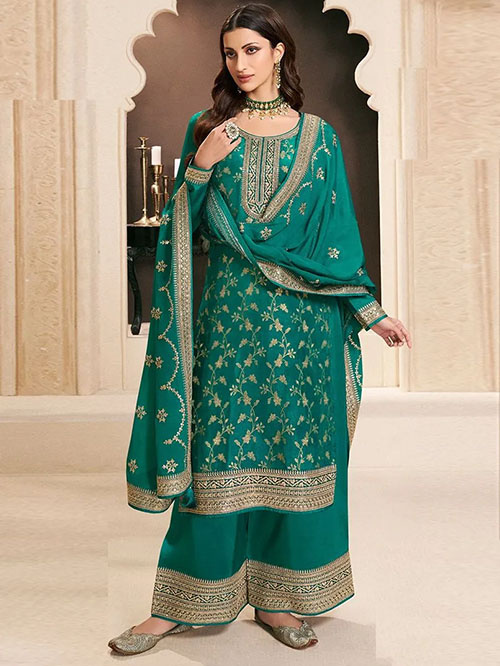 This beautiful salwar kameez palazzo suit top comes in silk and is enhanced with elegant work. The designer palazzo bottom (salwar) comes in premium santoon. Dupatta comes in chinon.