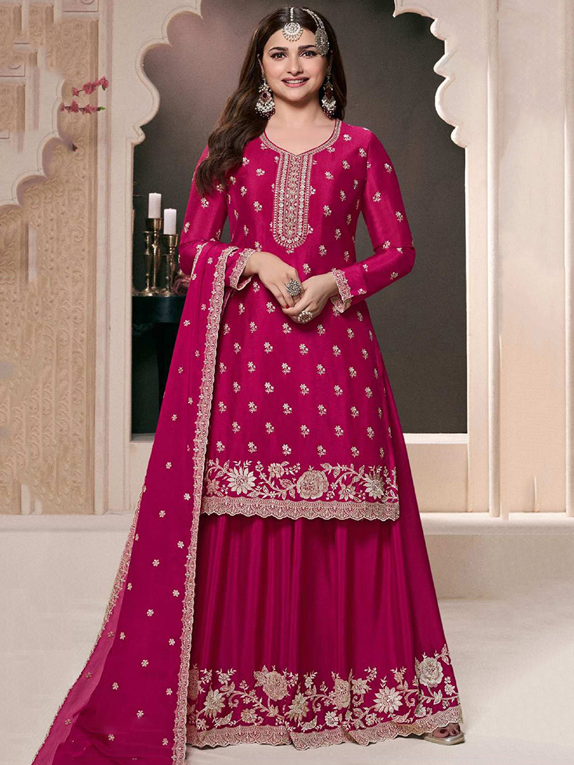 This is a beautiful salwar kameez sharara suit in a vibrant pink hue. - Top: The kameez is crafted from chinon fabric and features elegant embroidery work. It has a V-shaped neckline and full sleeves, adorned with intricate detailing. - Bottom: The sharara pants, also made from premium chinon, have a wide-leg design with ornate embroidery at the hem. - Dupatta: The chinon dupatta complements the outfit with matching embroidery and a decorative border. - Size: The dress is size S (AU 8). - Bust: 36 inches, with extra margin and stitch line. - Waist: 34-35 inches. - Includes a side or back zip for fit adjustment. This outfit showcases traditional elegance with its rich fabric and intricate detailing, perfect for festive occasions.