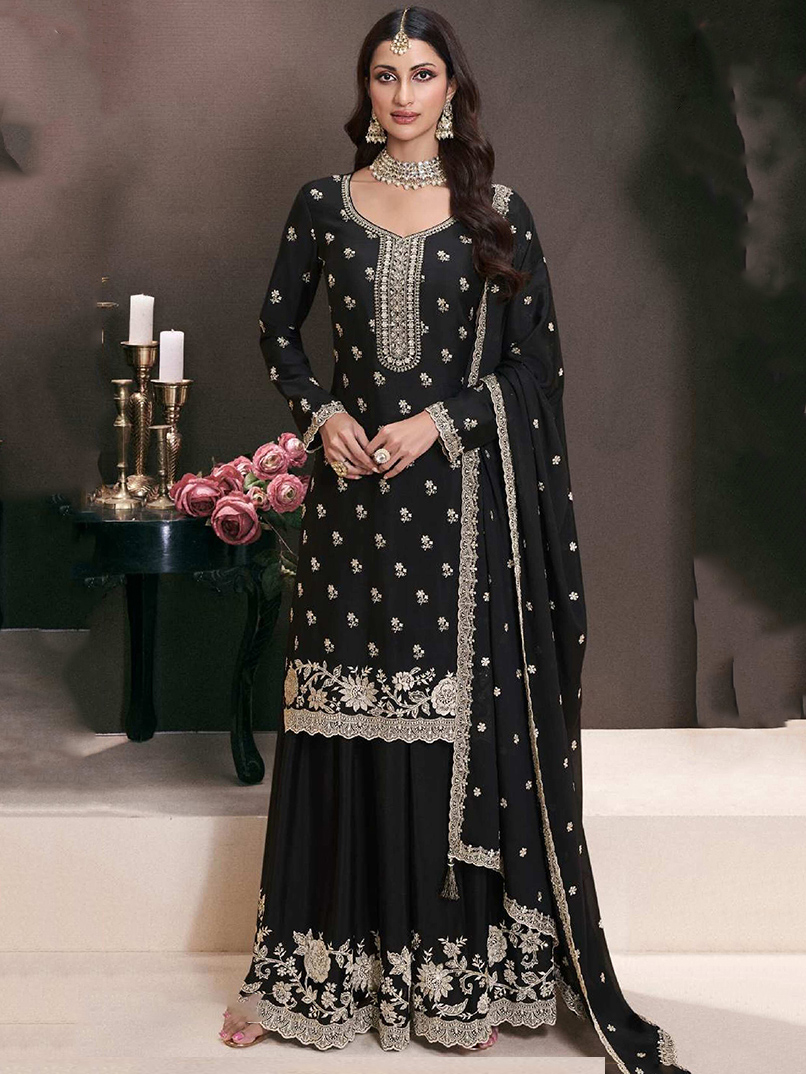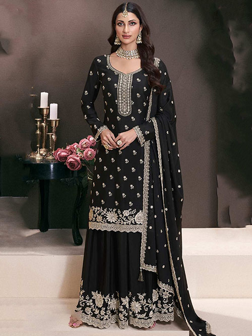 This beautiful salwar kameez sharara suit top comes in chinon and is enhanced with elegant work. The designer sharara bottom (salwar) comes in premium chinon. Dupatta comes in chinon.