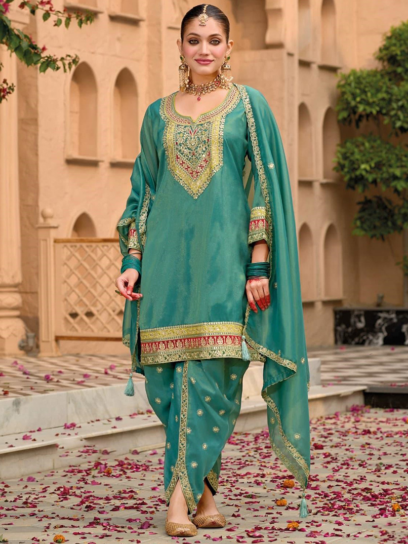This beautiful salwar kameez patiyala suit top comes in chinon silk and is enhanced with elegant work. The designer patiyala bottom (salwar) comes in premium chinon silk. Dupatta comes in chinon silk.