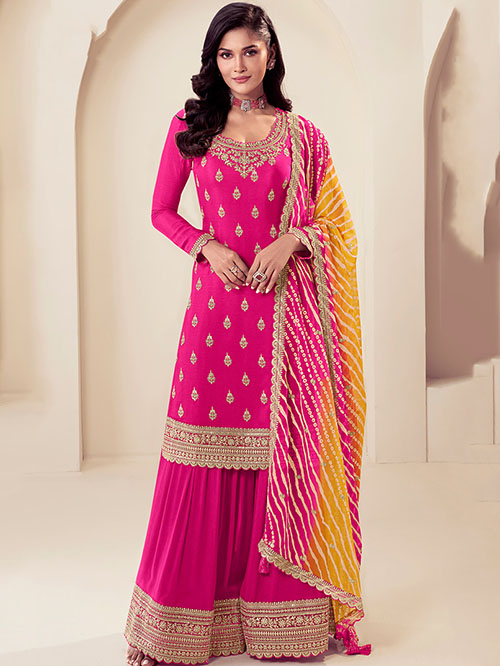 This beautiful salwar kameez sharara suit top comes in chinon and is enhanced with elegant work. The designer sharara bottom (salwar) comes in premium chinon. Dupatta comes in chinon.