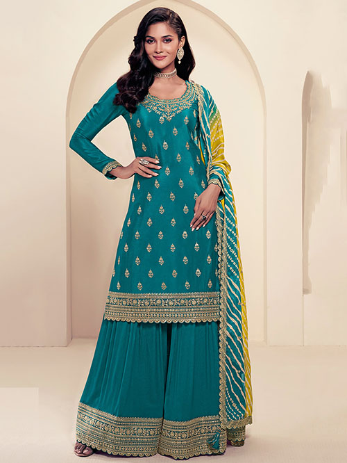 This beautiful salwar kameez sharara suit top comes in chinon and is enhanced with elegant work. The designer sharara bottom (salwar) comes in premium chinon. Dupatta comes in chinon.