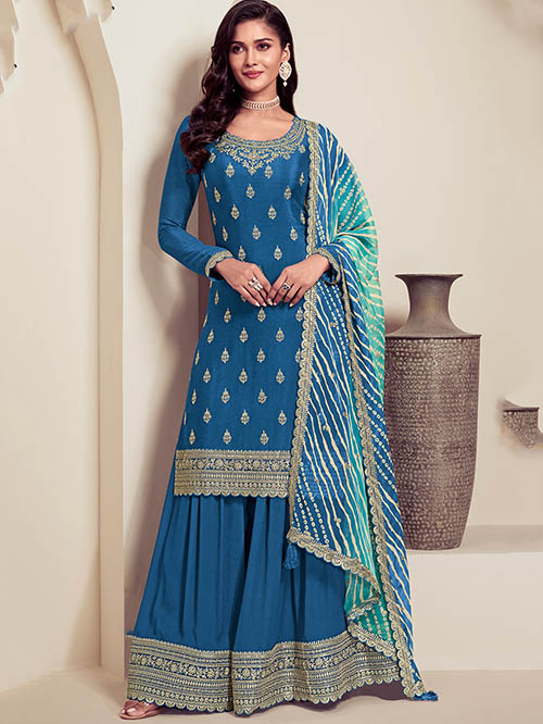This beautiful salwar kameez sharara suit top comes in chinon and is enhanced with elegant work. The designer sharara bottom (salwar) comes in premium chinon. Dupatta comes in chinon.