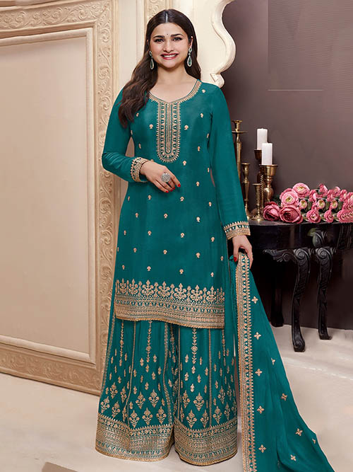 This beautiful salwar kameez sharara suit top comes in chinon and is enhanced with elegant work. The designer sharara bottom (salwar) comes in premium chinon. Dupatta comes in chinon.