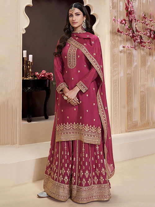 This beautiful salwar kameez sharara suit top comes in chinon and is enhanced with elegant work. The designer sharara bottom (salwar) comes in premium chinon. Dupatta comes in chinon.