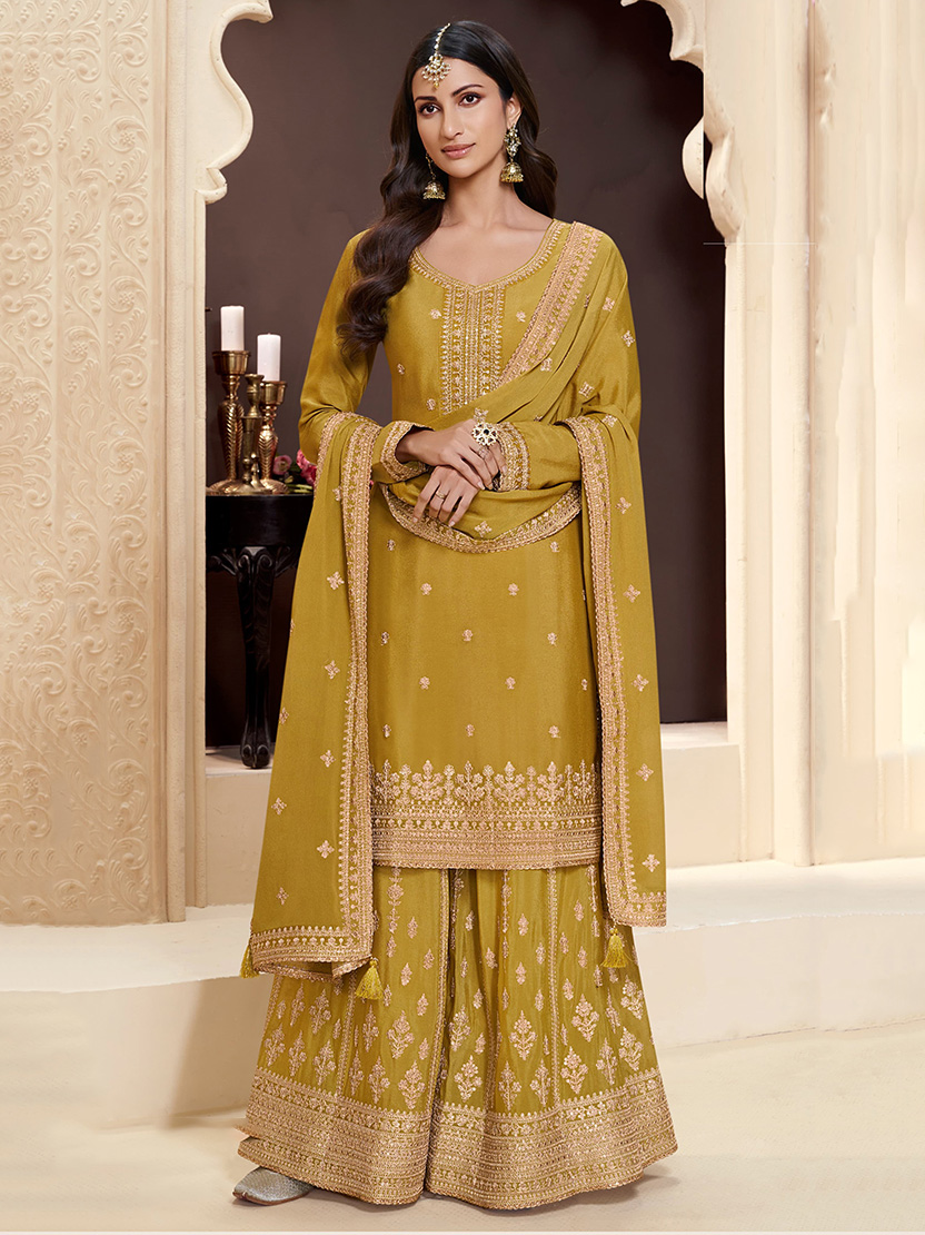This beautiful salwar kameez sharara suit top comes in chinon and is enhanced with elegant work. The designer sharara bottom (salwar) comes in premium chinon. Dupatta comes in chinon.