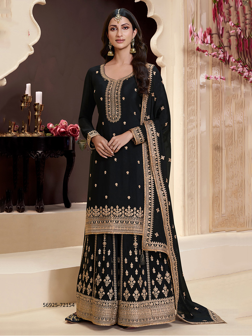 The salwar kameez sharara suit in the image is beautifully designed in a rich black chinon fabric. It features intricate embellishments with detailed work that adds elegance and sophistication to the outfit. Top (Kameez): - Fabric : Chinon - Design : Enhanced with elegant embroidery and intricate patterns. - Neckline : Stylish and well-defined, embroidered neckline. - Sleeves : Long sleeves with matching embroidery at the cuffs. - Size : XL (AU 14) with a bust size of 42 inches. It includes extra margin and a stitch line with a zip on the side or back for convenience. Bottom (Sharara): - Fabric : Premium Chinon - Design : Flared sharara with ornate detailing running along the length, coordinating with the design of the kameez. Dupatta: - Fabric : Chinon - Design : Features matching embroidery that complements the rest of the outfit, bordered with decorative detailing. Waist Size: - Waist : 39-40 inches This outfit perfectly marries traditional aesthetics with modern elegance, making it suitable for festive occasions or special events.