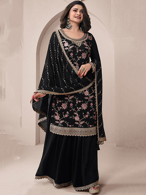 This beautiful salwar kameez sharara suit top comes in chinon and is enhanced with elegant work. The designer sharara bottom (salwar) comes in premium chinon. Dupatta comes in chinon.
