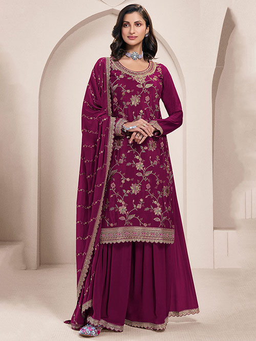 This beautiful salwar kameez sharara suit features a top made from chinon fabric, enhanced with elegant embroidery. The designer sharara bottom is also made from premium chinon, creating a cohesive and stylish look. The dupatta complements the ensemble, also crafted from chinon. Size Details: - Size: L (AU 12) - Bust: 40 inches (with extra margin & stitch line, zip on side or back) - Waist: 37-38 inches The ensemble is rich in design, showcasing intricate floral embroidery on a deep, luxurious color, offering elegance and sophistication suitable for special occasions.