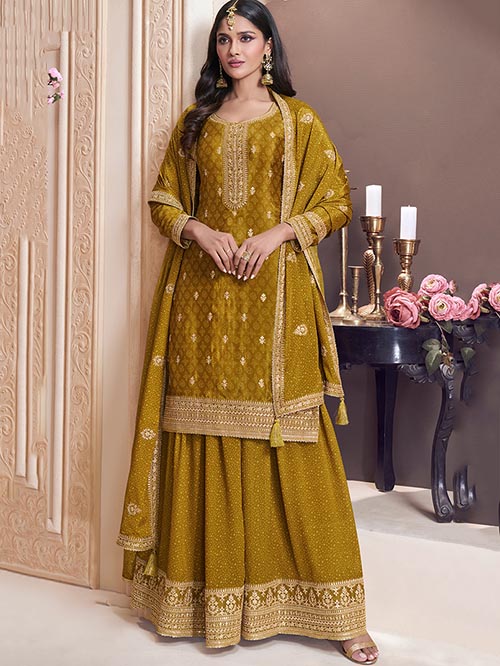 This beautiful salwar kameez sharara suit top comes in chinon and is enhanced with elegant work. The designer sharara bottom (salwar) comes in premium chinon. Dupatta comes in chinon.