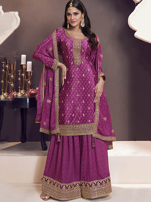 This beautiful salwar kameez sharara suit top comes in chinon and is enhanced with elegant work. The designer sharara bottom (salwar) comes in premium chinon. Dupatta comes in chinon.