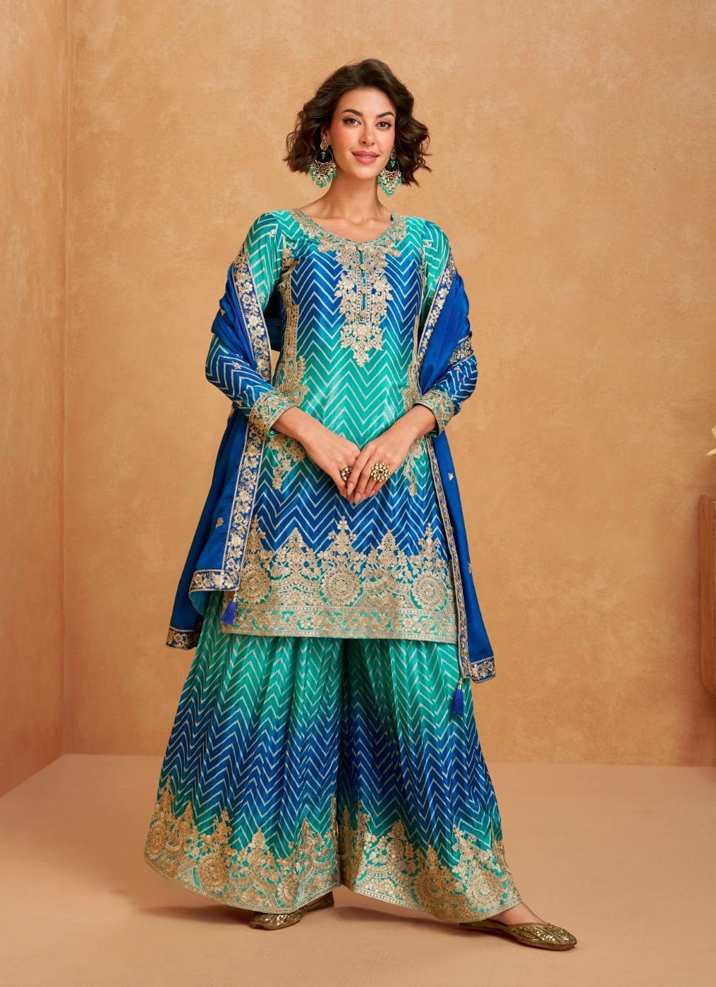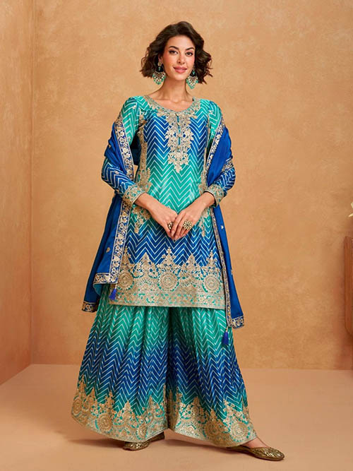 This beautiful salwar kameez sharara suit top comes in chinon silk and is enhanced with elegant work. The designer sharara bottom (salwar) comes in premium chinon silk. Dupatta comes in chinon silk.