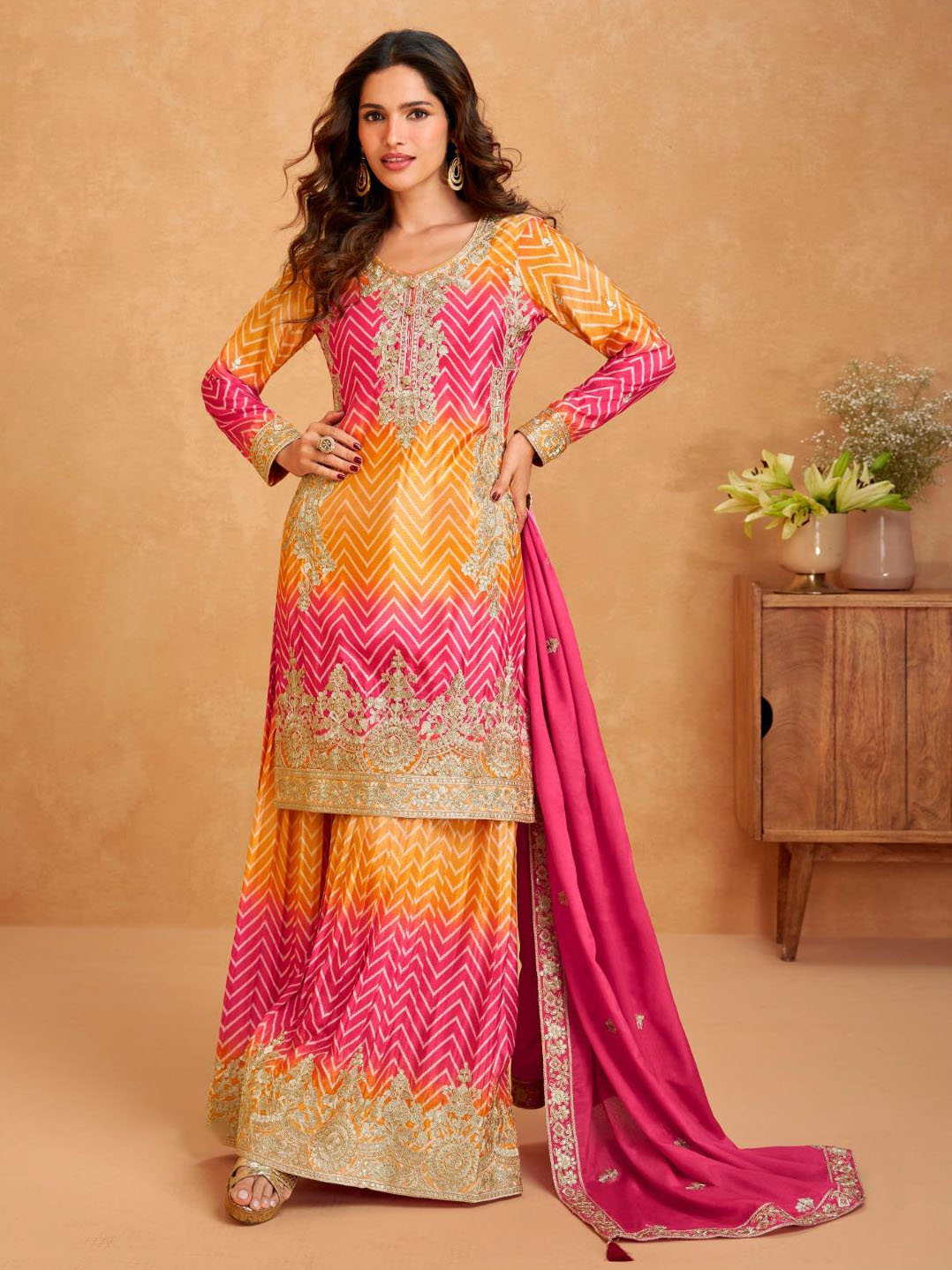 This beautiful salwar kameez sharara suit top comes in chinon silk and is enhanced with elegant work. The designer sharara bottom (salwar) comes in premium chinon silk. Dupatta comes in chinon silk.