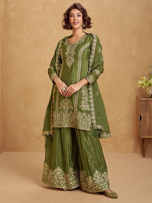 This beautiful salwar kameez palazzo suit top comes in chinon silk and is enhanced with elegant work. The designer palazzo bottom (salwar) comes in premium chinon silk. Dupatta comes in chinon silk.