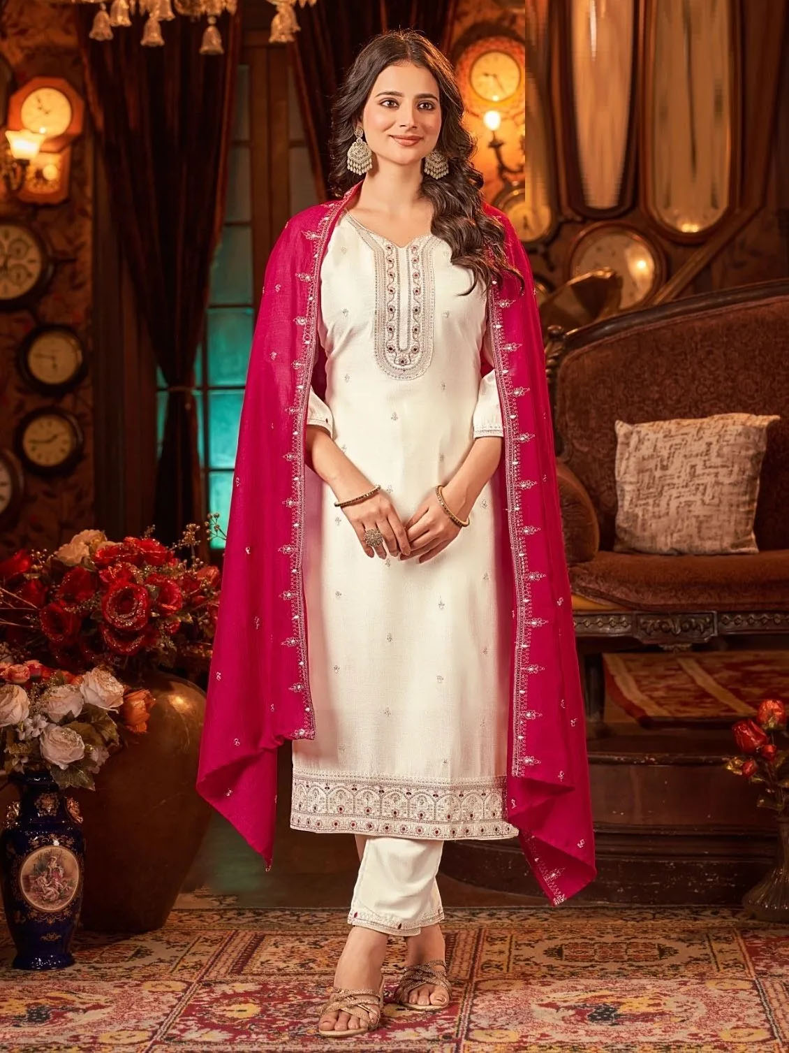 This beautiful salwar kameez pant suit top comes in vichitra silk and is enhanced with elegant work. The designer pant bottom (salwar) comes in premium vichitra silk. Dupatta comes in vichitra silk.