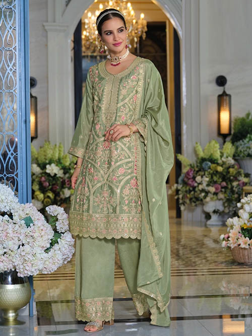 This beautiful salwar kameez palazzo suit top comes in chinon and is enhanced with elegant work. The designer palazzo bottom (salwar) comes in premium chinon. Dupatta comes in chinon.