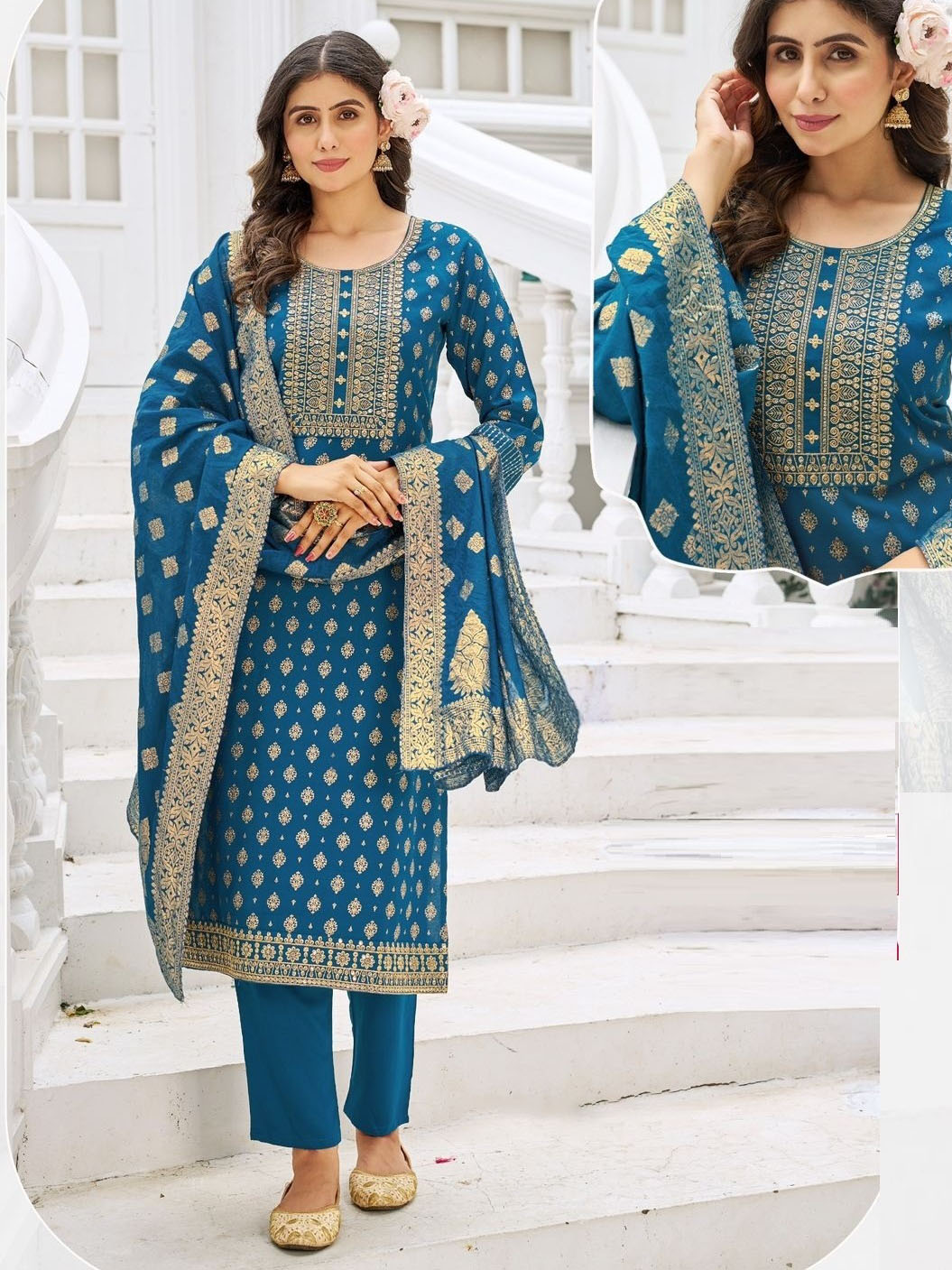 This is a beautiful salwar kameez set featuring: - Top : Made from rayon with elegant gold embroidery and design, including a detailed neckline and borders. It has long sleeves and an overall majestic look. - Bottom (Salwar) : Comes in premium rayon with a complementary solid color, tailored to a fitted style. - Dupatta : Made from jacquard fabric, matching the top with intricate patterns and a decorative border. - Size : 4XL (AU 20) - Bust : 48 inches - Waist : 46-47 inches The ensemble has a rich blue tone with luxurious golden detailing, ideal for festive occasions or special events.