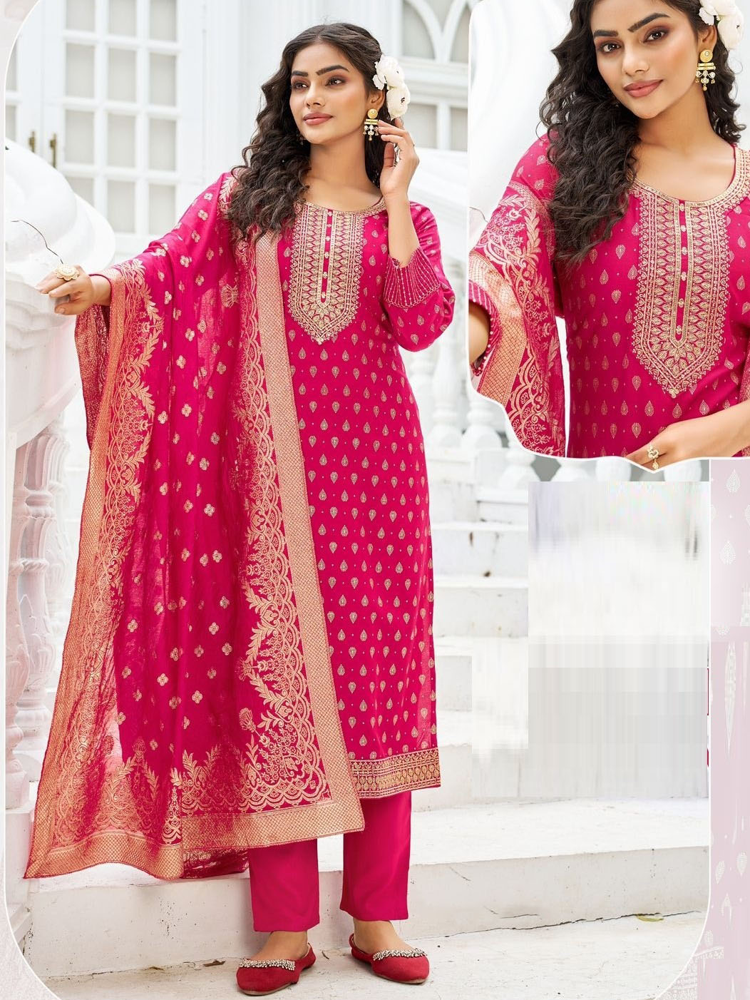 This beautiful salwar kameez pant suit top comes in rayon and is enhanced with elegant work. The designer pant bottom (salwar) comes in premium rayon. Dupatta comes in jacquard.