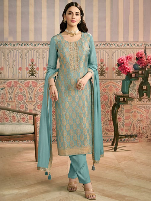 This beautiful salwar kameez pant suit top comes in jacquard and is enhanced with elegant work. The designer pant bottom (salwar) comes in premium santoon. Dupatta comes in silk georgette.