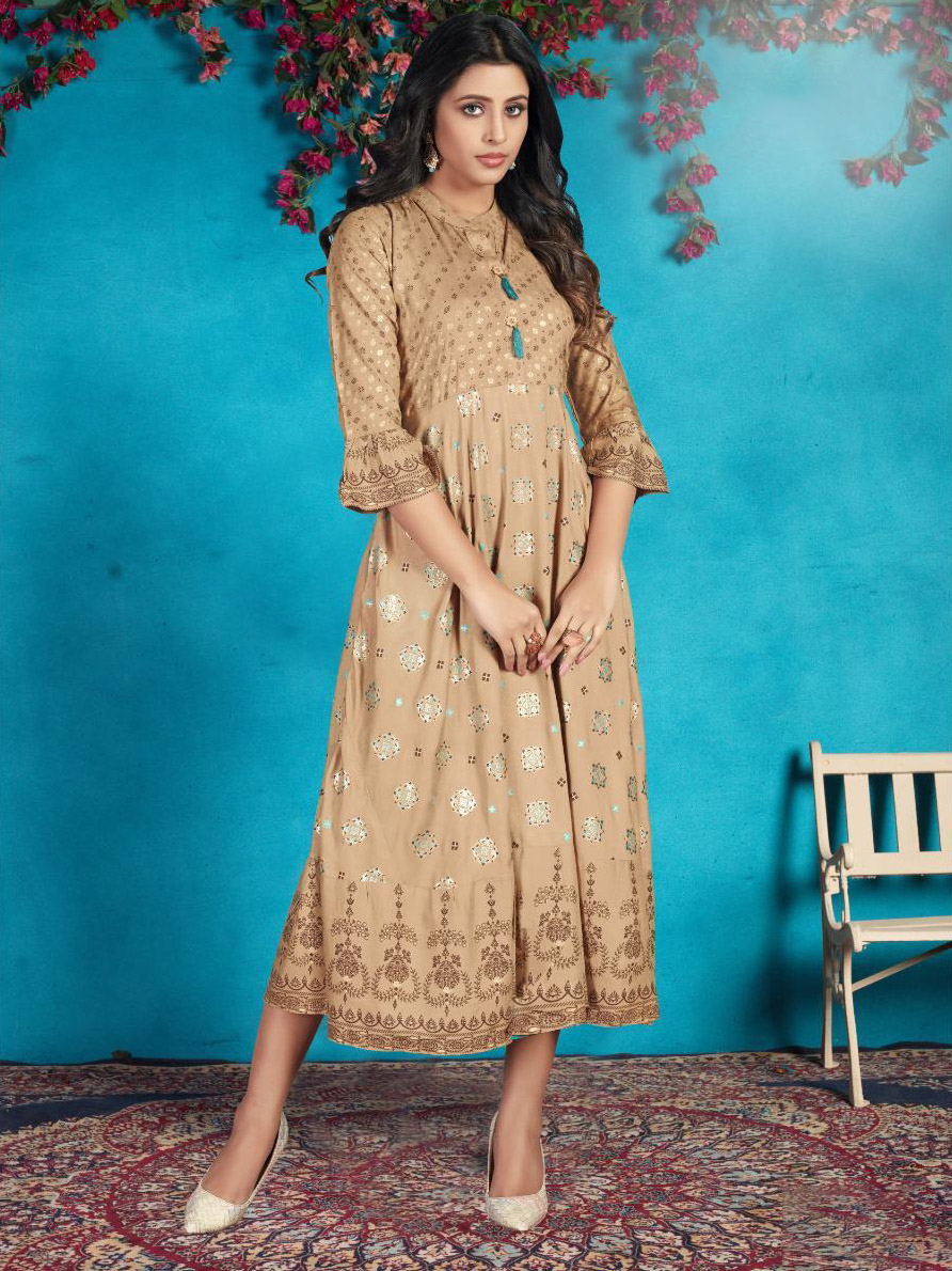 This ready to wear stylish kurti is an essential. Top comes in rayon with gold print.