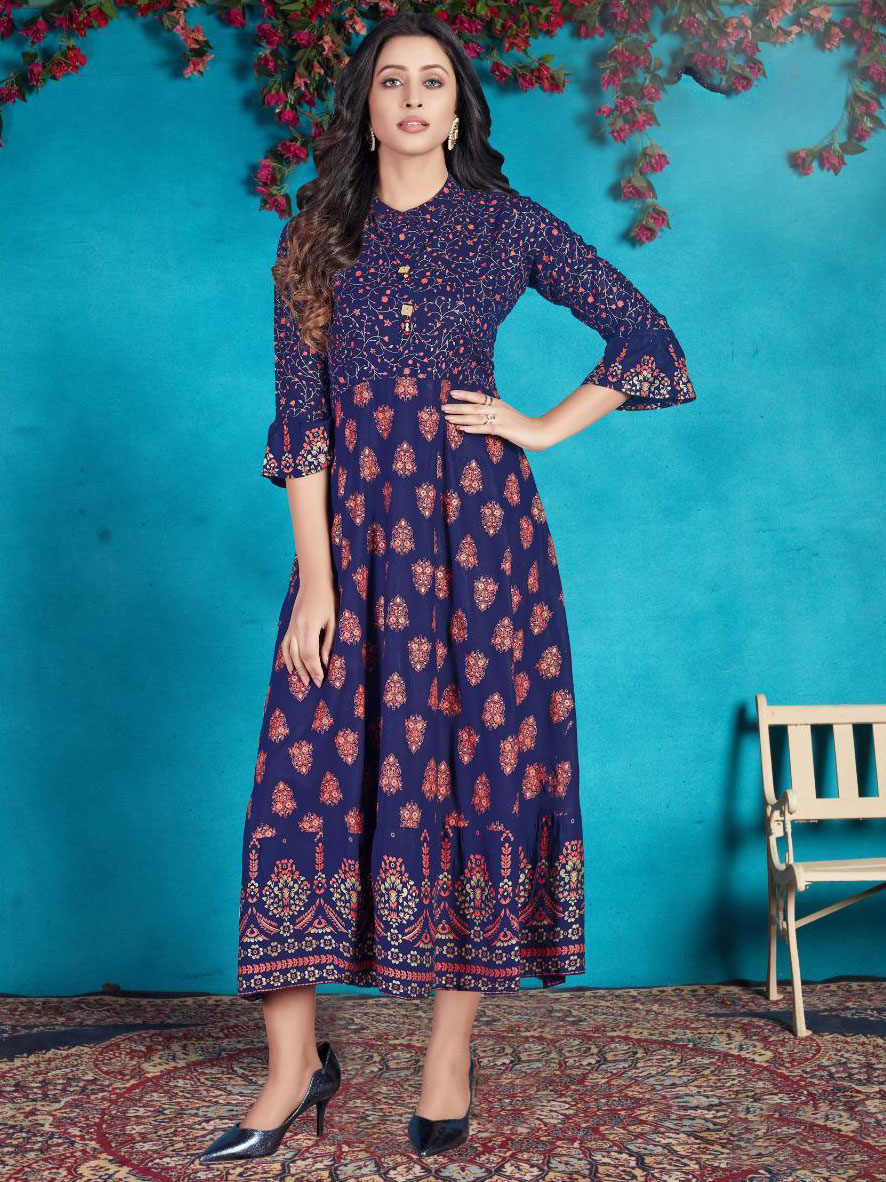 This ready to wear stylish kurti is an essential. Top comes in rayon with gold print.