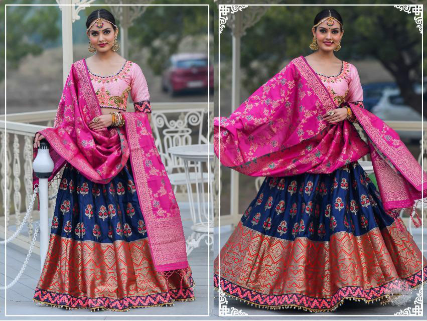 This fabulous designer bright beautifully crafted premium banarasi silk lehenga is enhanced with jacquard work. Blouse comes in phantom silk with embroidery. Dupatta comes in banarasi jacquard.