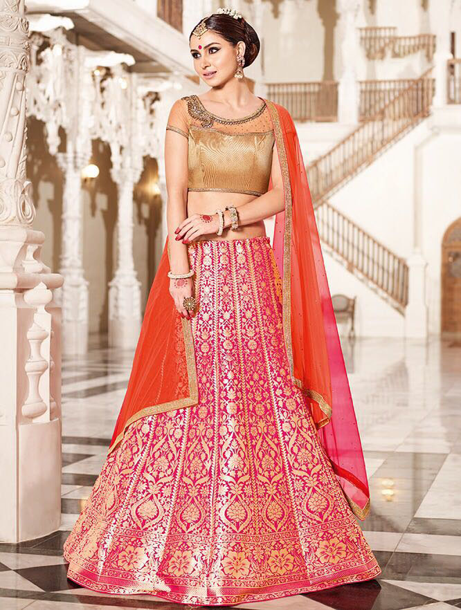 This fabulous designer bright beautifully crafted pure banarasi silk lehenga is enhanced with golden zari and border work. Blouse comes in bangalori silk and net. Dupatta comes in net with border work.
