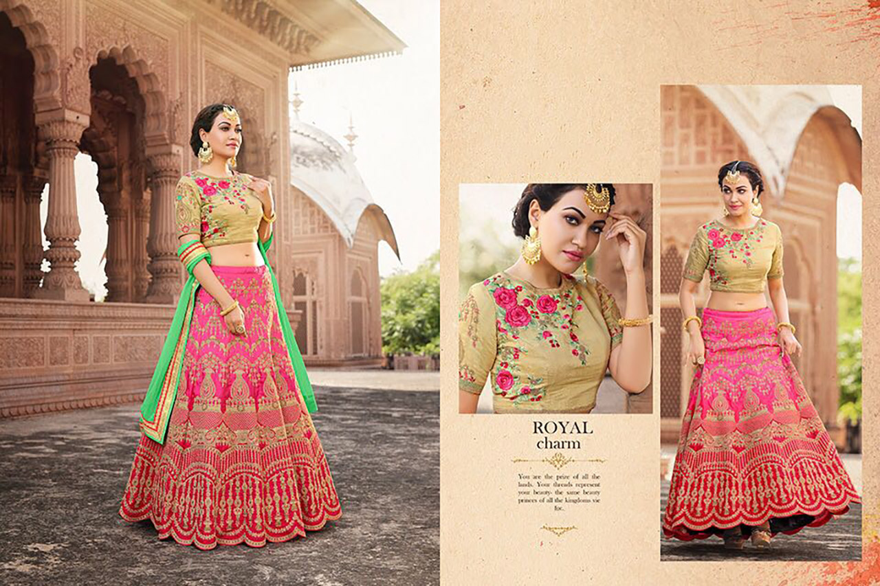 This fabulous designer bright beautifully crafted bangalori silk lehenga is enhanced with golden zari and border work. Blouse comes in bhagalpuri silk / net and enhanced with heavy work. Dupatta comes in premium georgette.