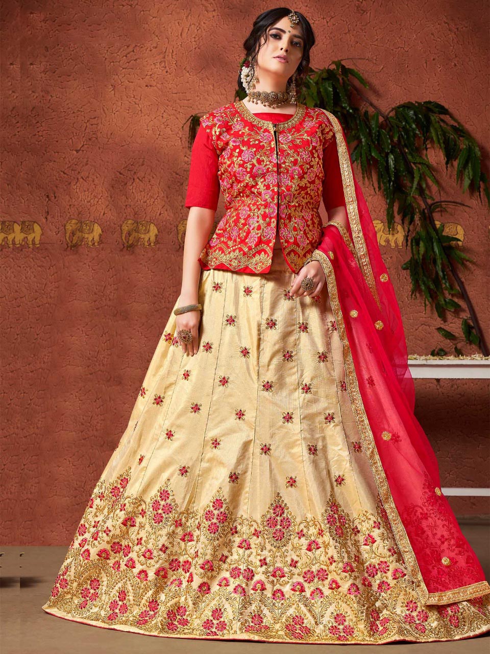 This fabulous designer bright beautifully crafted premium silk lehenga is enhanced with golden zari and border work. Long top comes in silk with zari work. Dupatta comes in premium net with work.