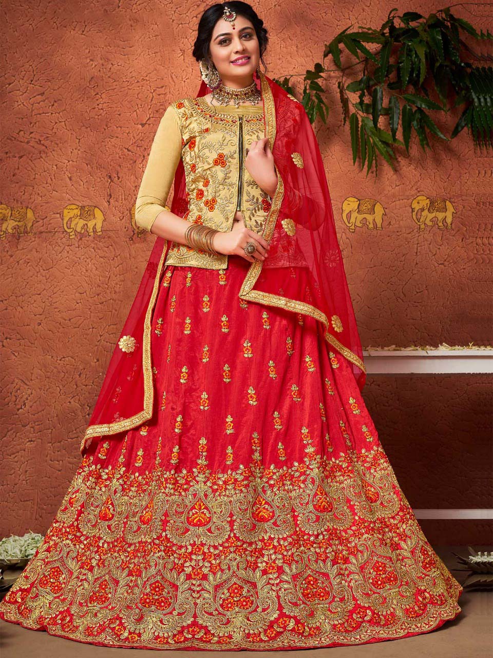 This fabulous designer bright beautifully crafted premium silk lehenga is enhanced with golden zari and border work. Long top comes in silk with zari work. Dupatta comes in premium net with work.