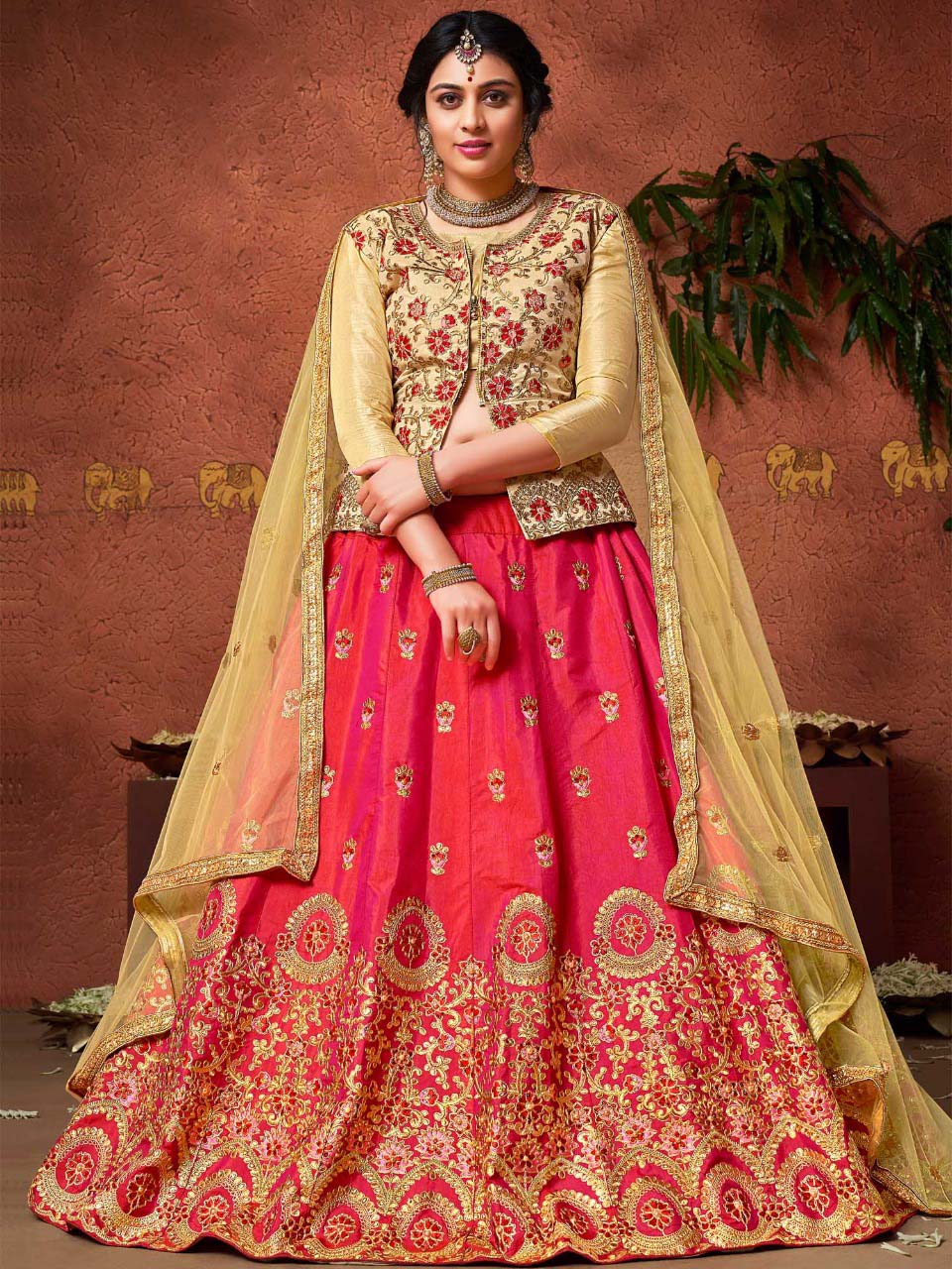 This fabulous designer bright beautifully crafted premium silk lehenga is enhanced with golden zari and border work. Long top comes in silk with zari work. Dupatta comes in premium net with work.