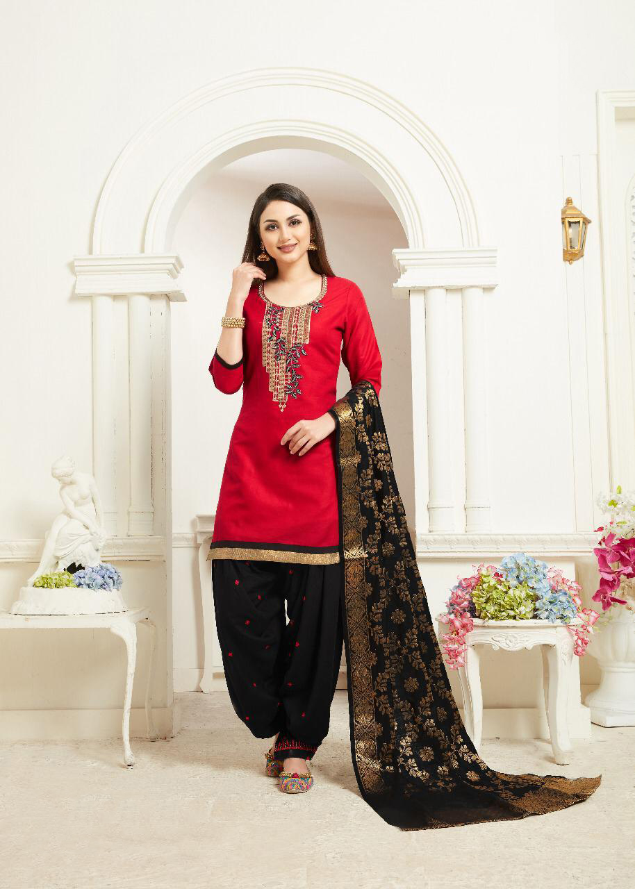 This gorgeous ready to wear Patiala/patiyala salwar kameez comes with beautiful banarasi dupatta. Top comes in premium quality jam silk and bottom comes in premium rayon. Dupatta comes in banarasi jacquard.