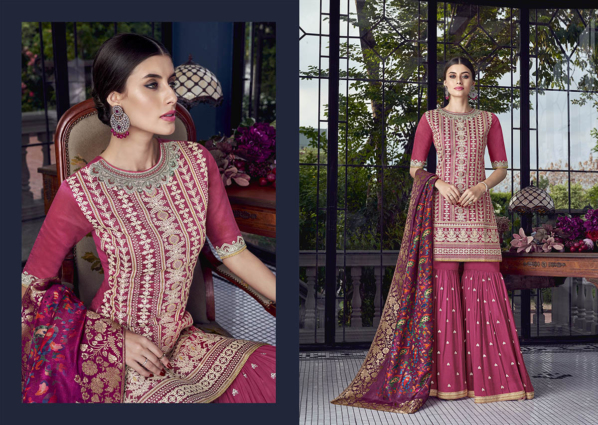 This beautiful readymade premium silk top enhanced with elegant lakhnavi work. Bottom comes in premium georgette santoon. This dress comes with digital print jacquard dupatta.