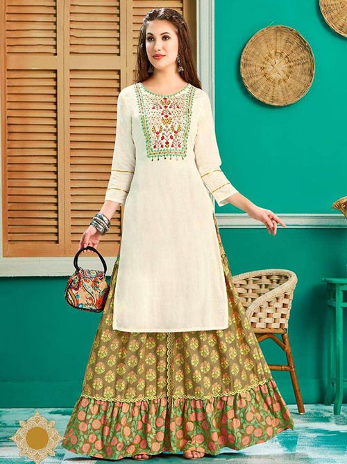 This beautiful readymade salwar kameez comes with a premium mal top enhanced with elegant work. Bottom comes in rayon printed skirt.