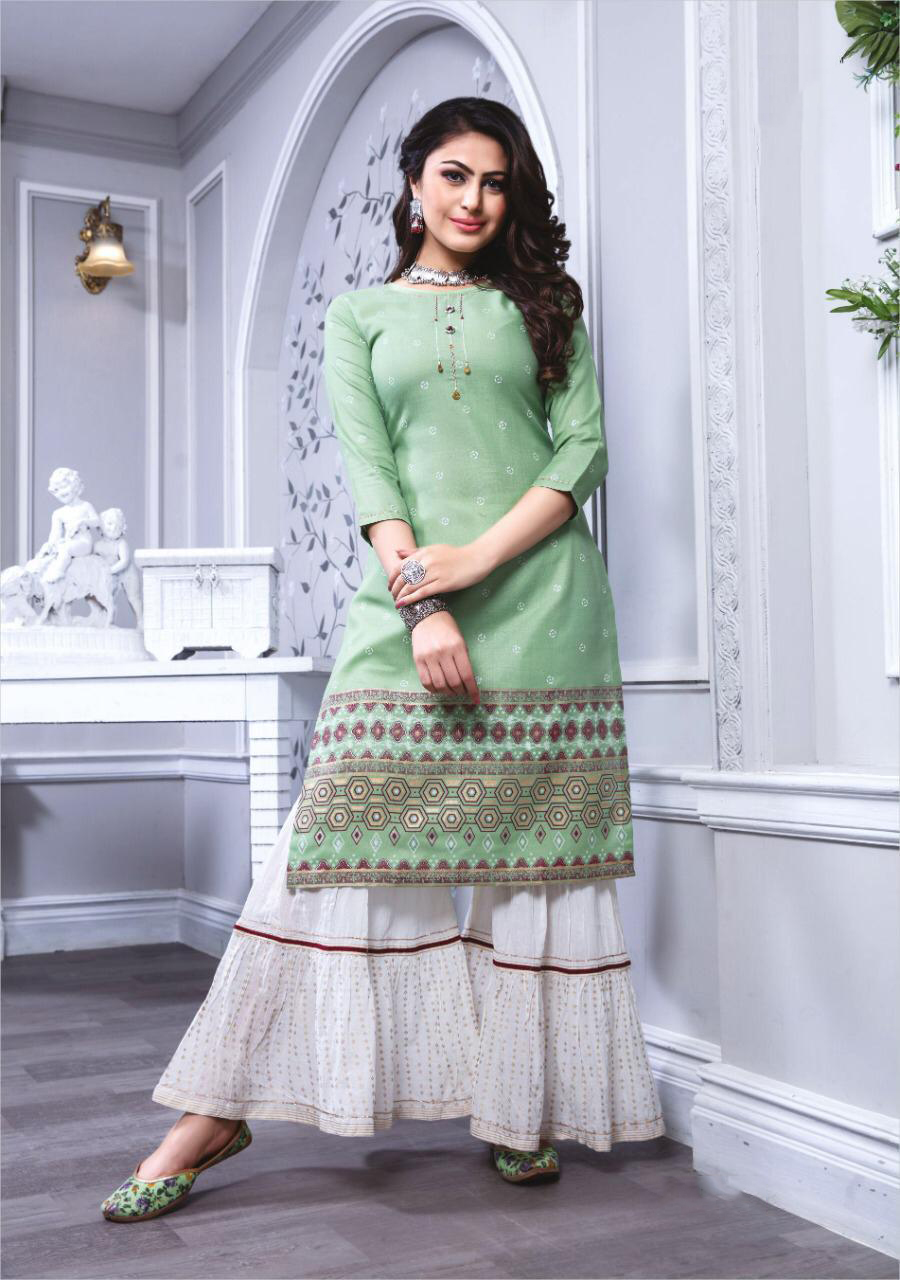 This beautiful readymade salwar kameez comes with a premium cotton top enhanced with elegant work. Sharara comes in cotton.