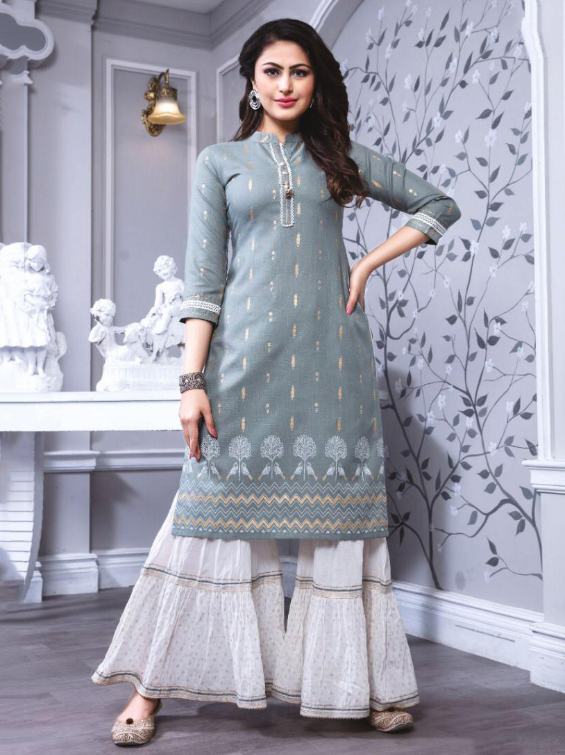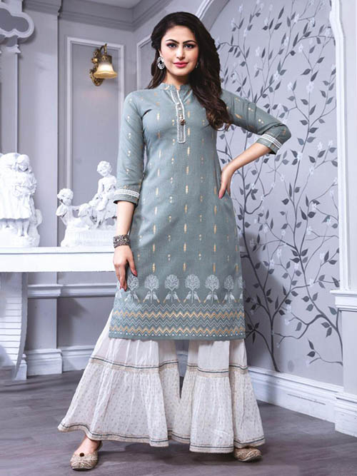 This beautiful readymade salwar kameez comes with a premium cotton top enhanced with elegant work. Sharara comes in cotton.