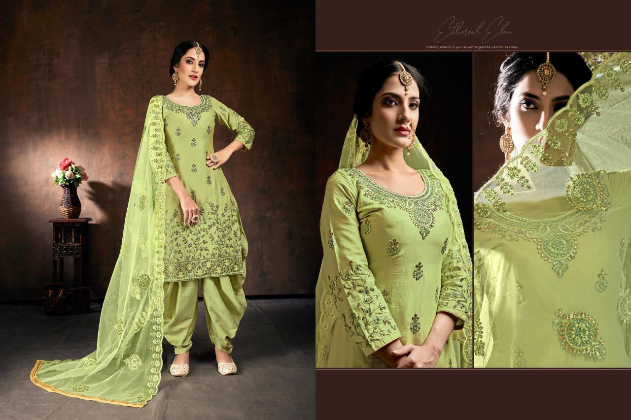 This beautiful elegant readymade patiala salwar kameez top comes in pure jam silk with embroidery and stone work and bottom comes in premium jam silk. Dupatta comes in premium net with embroidery and stone work. Bust: 46" Waist: 44"-45"